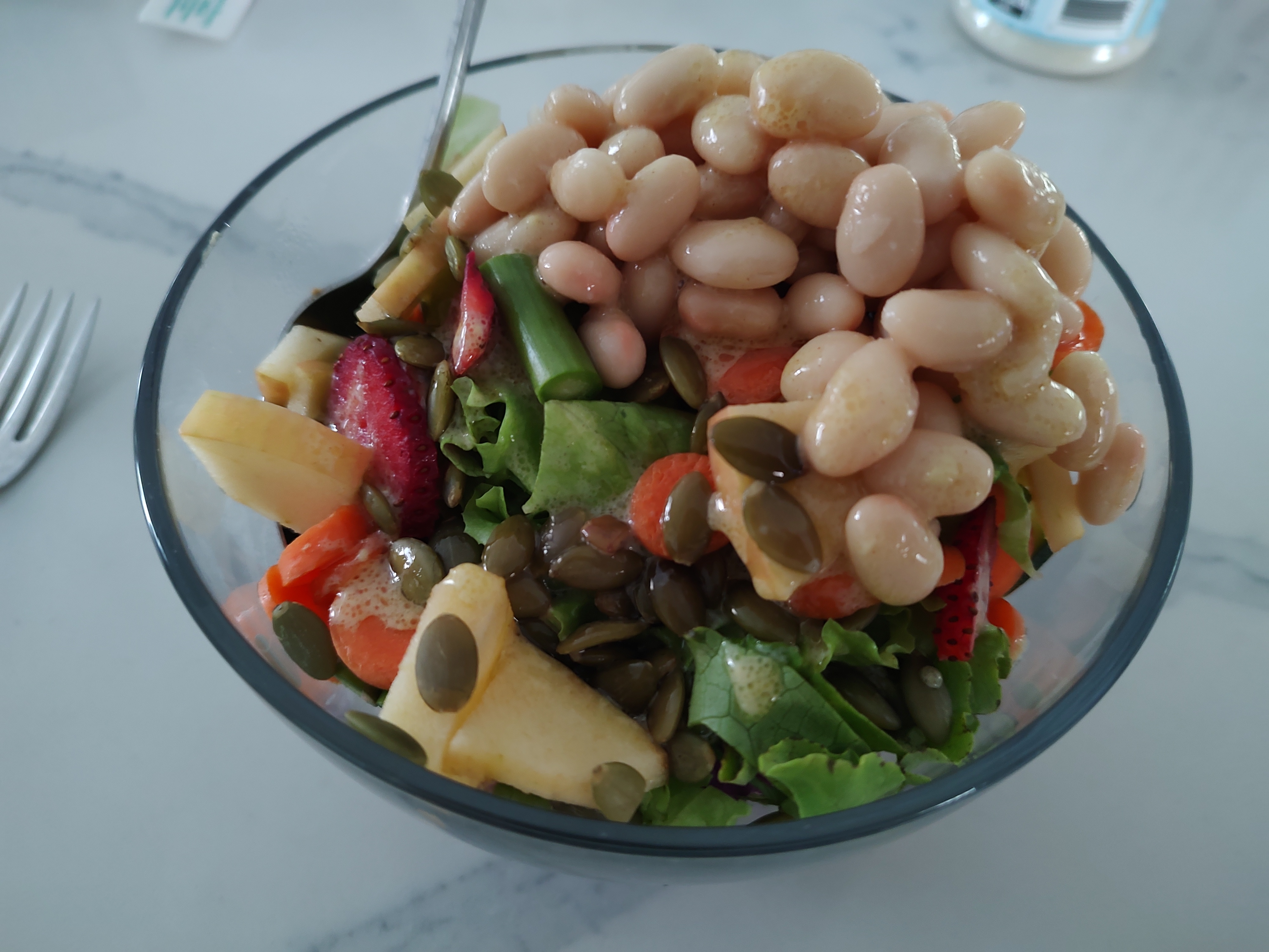 Chop all the ingredients and layer in a bowl. Use whatever beans (black beans, garbanzo beans, kidney beans) or other protein source. If using rice or quinoa, you can layer rice or quinoa with the vegetables and fruits in the bowl. You can also use a small chicken breast or two eggs to make a complete meal. You can make enough ingredients for several bowls and store in the refrigerator.